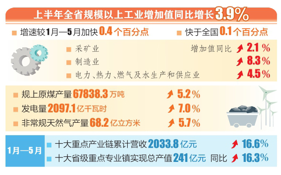 省统计局日前发布上半年全省经济运行情况,我省工业保持平稳增长。上半年,全省规模以上工业增加值同比增长3.9%,增速较1月—5月加快0.4个百分点,快于全国0.1个百分点。全省采矿业增加值同比增长2.1%,制造业增长8.3%,电力、热力、燃气及水生产和供应业增长4.5%。